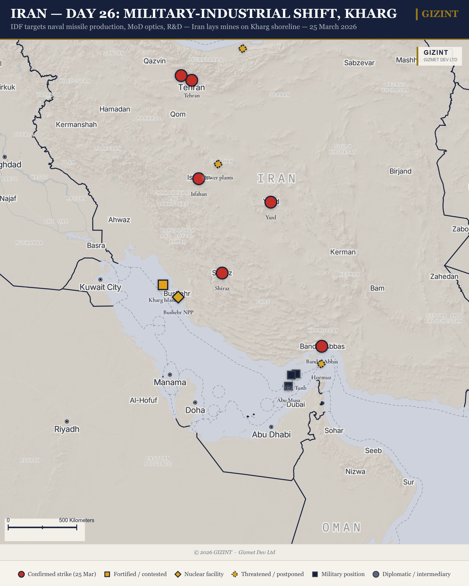 An Iranian national security analyst stated on IRIB that Iranian forces are "ready to seize the coastline of the UAE and Bahrain" if the US launches a ground operation (EADaily, MEMRI, 25 Mar) — the most expansionist declaratory threat of the campaign, escalating from "crushing strikes on Ras al-Khaimah" five days earlier. Iran lacks amphibious capability against US naval forces; the coercion signal to GCC states is the operative effect. Parliament Speaker Ghalibaf warned on X of imminent island seizure while attributing the war to US military leadership rather than Trump — leaving diplomatic space. He is widely assessed as the likely Iranian negotiating counterpart (Bloomberg, AP, 25 Mar).